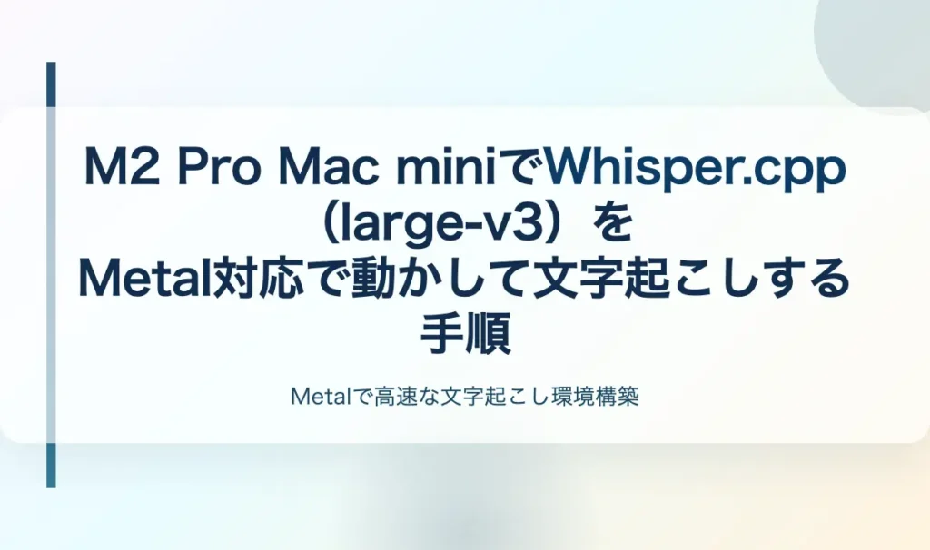本記事は、Apple Silicon搭載のMac mini(M2 Pro)を対象とする。GPUアクセラレーションにはMetalを用い、Core MLは使用しない構成である。macOSはSonoma 14以降、XcodeとCommand Line Toolsがインストールされているものとする。 まず、開発環境を確認する。 xcode-select --install brew install cmake ffmpeg gitxcode-select --install b... -