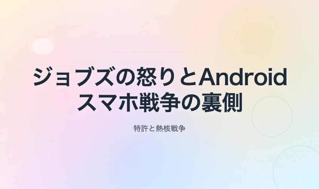 2007年1月、ジョブズはiPhoneを発表しスマートフォン市場を一変させた。これに衝撃を受けたGoogleのモバイルチームは、従来計画していたAndroid携帯(通称「Sooner」)を撤回し、新たにマルチタッチ対応デバイスの開発に着手したという。こうして2007年末にAndroid OSが発表されると、ジョブズはAndroidを「盗作(stolen product)」と看做し... -